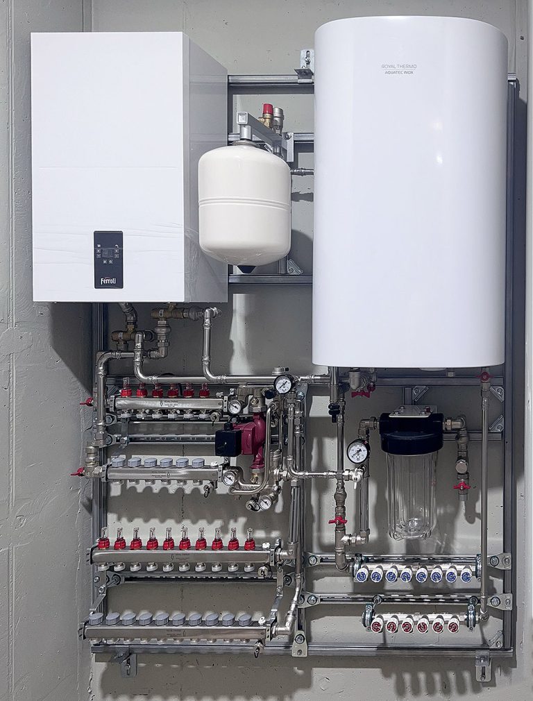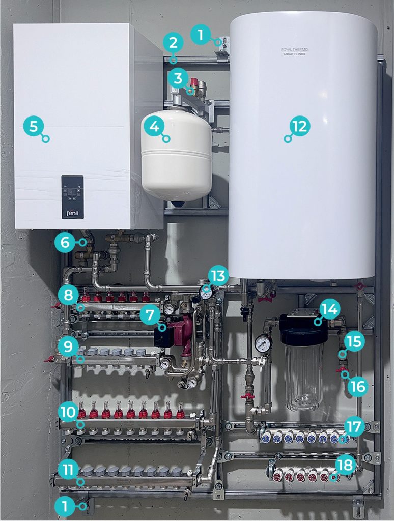 1. Электрический одноконтурный настенный котёл Ferroli TOR 12.0 — 12кВт или может комплектоваться настенным газовым одноконтурным котлом HAIER или MIZUDO на 24кВт и дымоход
